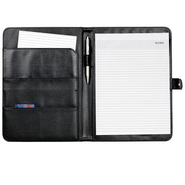 • Teczka wyposażona w kieszonkę na wizytówki, przegródkę na dokumenty oraz wkład papierowy A4