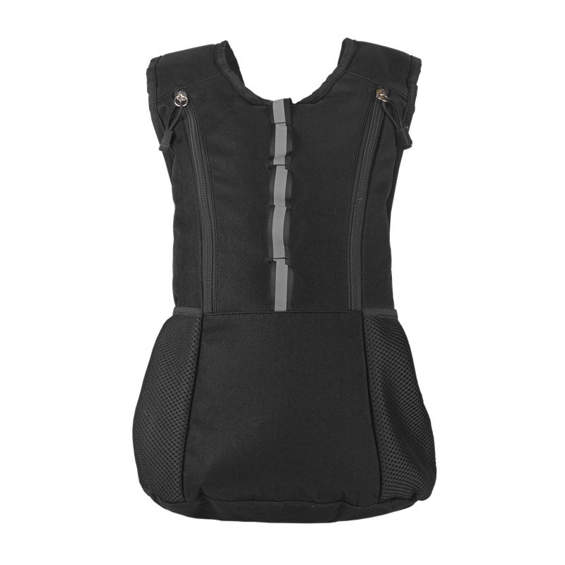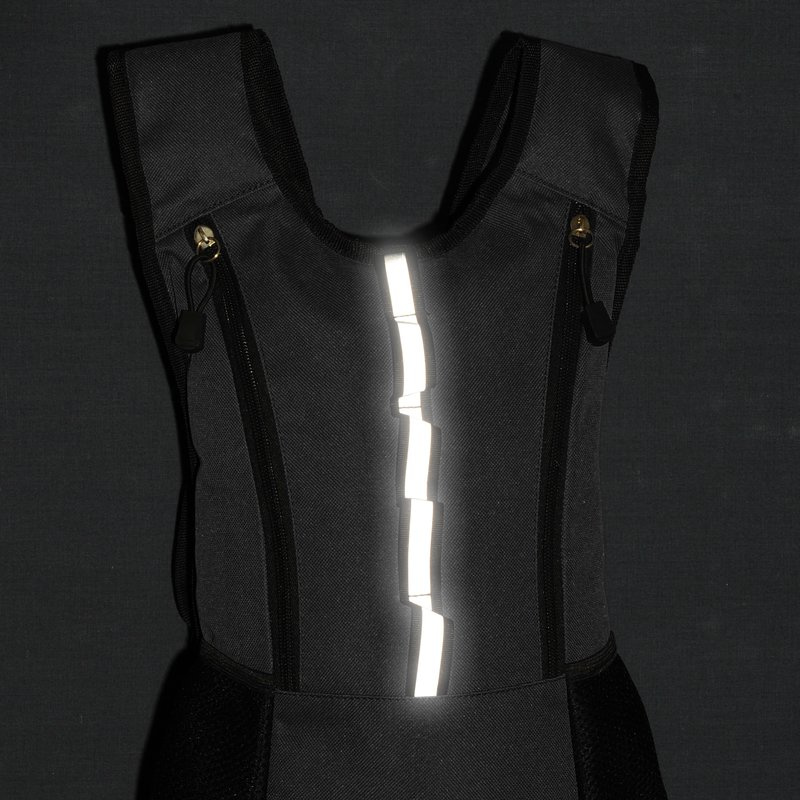 - Wyposażony w regulowane szelki i odblaskową naszywkę.