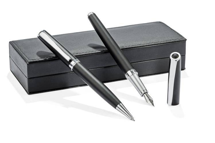 - Przybory piśmiennicze wykonane z metalu zapakowane są w etui z czarnej ekoskóry.