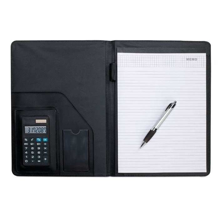 Teczka A4 z imitacji skóry, z kalkulatorem na baterię słoneczną, długopisem z niebieskim wkładem i notesem w linie (20 kartek).
