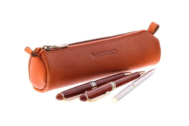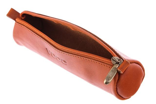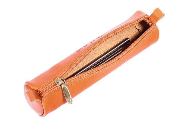 Okrągły piórnik z naturalnej skóry juchtowej. Elegancki, posłuży wiele lat użytkowania. Zamykany na suwak.