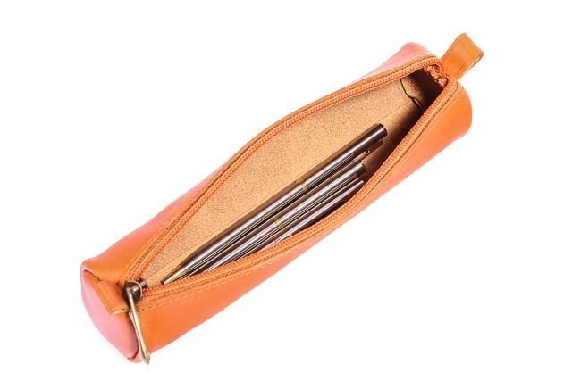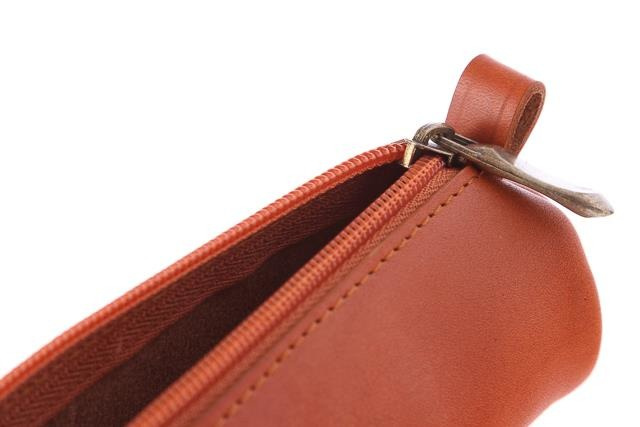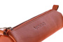 Okrągły piórnik z naturalnej skóry juchtowej. Elegancki, posłuży wiele lat użytkowania. Zamykany na suwak.