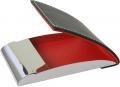 Etui na wizytówki wykonane z metalu chromowanego, oprawione w ekoskórę.