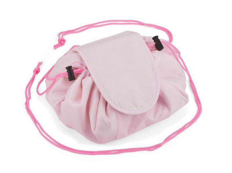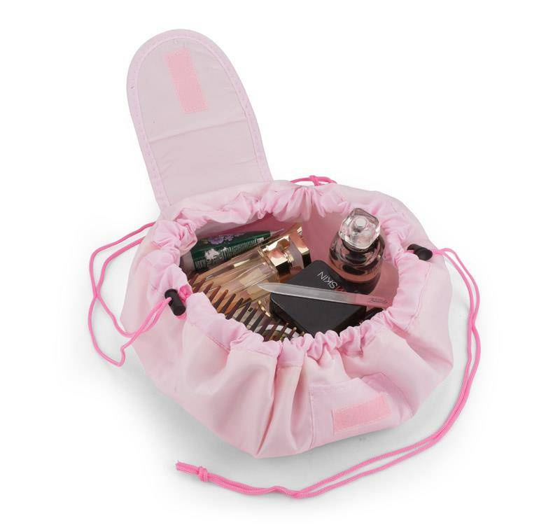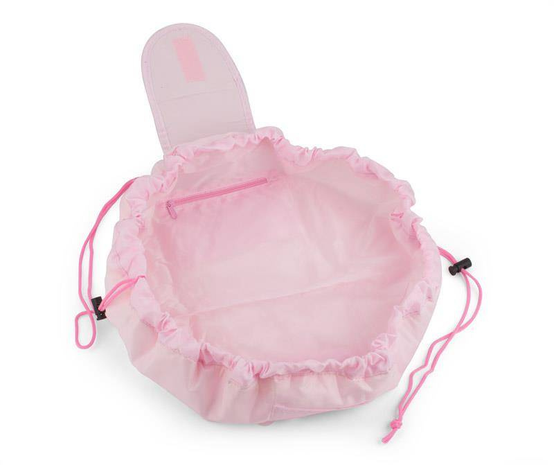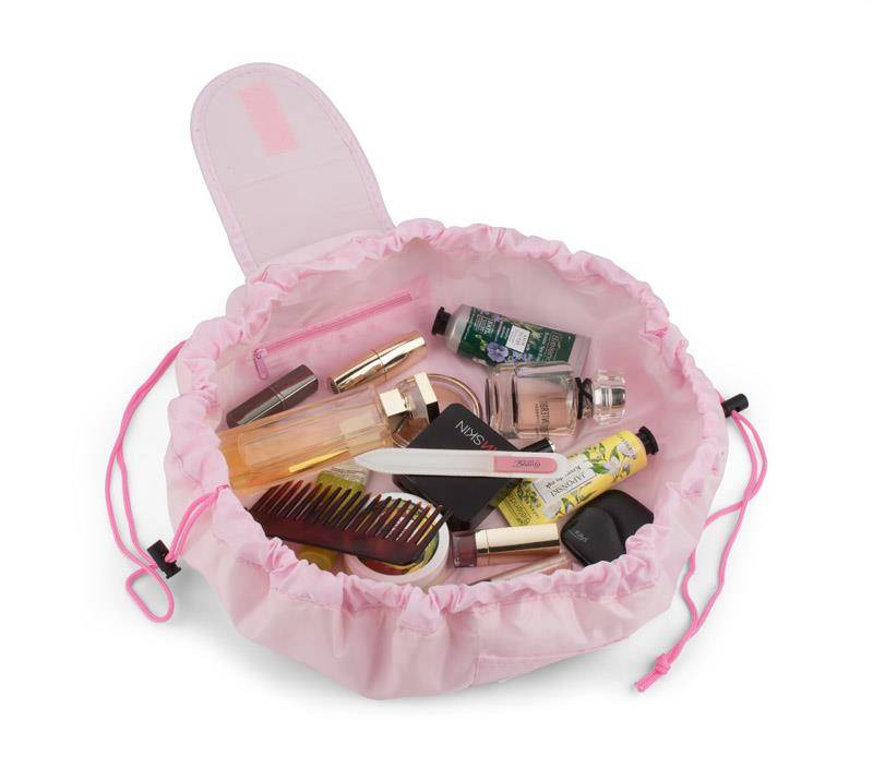 Główna komora kosmetyczki zamykana za pomocą ściągnięcia sznureczków oraz klapki na rzep.