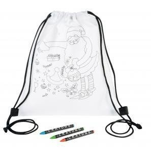 Plecak do kolorowania COLOURFUL SANTA z nadrukowanym motywem świątecznym i 3 kredki woskowymi przeznaczonymi do kolorowania.