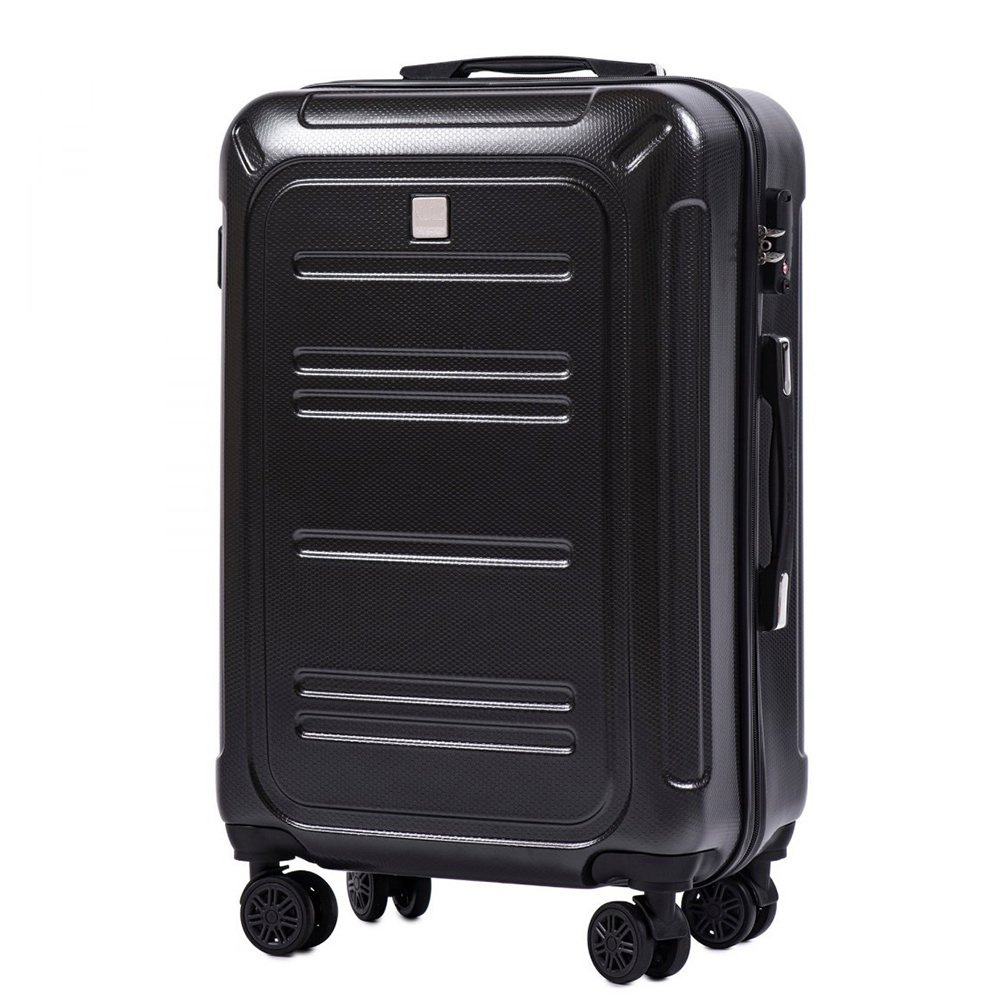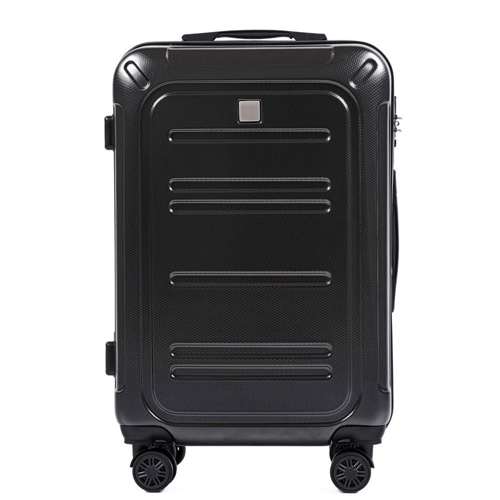 Nowoczesny, lekki model wykonany z bardzo wytrzymałego i odpornego na zarysowanie poliwęglanu, z dwupoziomową teleskopową rączką. Zewnętrzne, przyjemne w dotyku gumowe uchwyty oraz zamek szyfrowy uniemożliwiający dostanie się do wnętrza osobom niepożądanym. Trwały, duraluminiowy stelaż wbudowany w walizkę. Wyposażony w cztery, podwójne obrotowe kauczukowo-gumowe kółka, które zapewniają stabilność oraz lekkość prowadzenia w dowolnym kierunku. Wnętrze w ciemnym sygnowanym kolorze dzielone zamkiem błyskawicznym na dwie funkcjonalne komory.