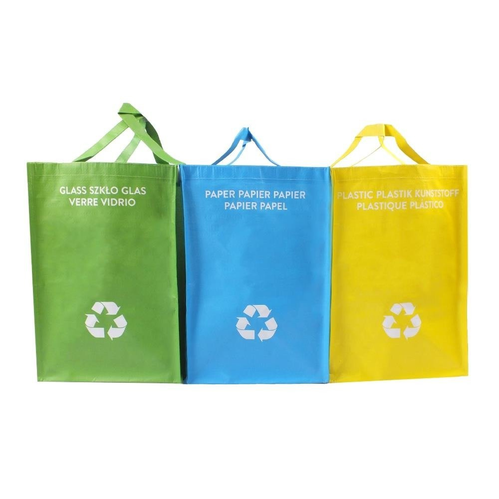 - Zestaw 3 toreb do segregacji szkła, papieru i plastiku, torby posiadają nadruk z przodu i z tyłu