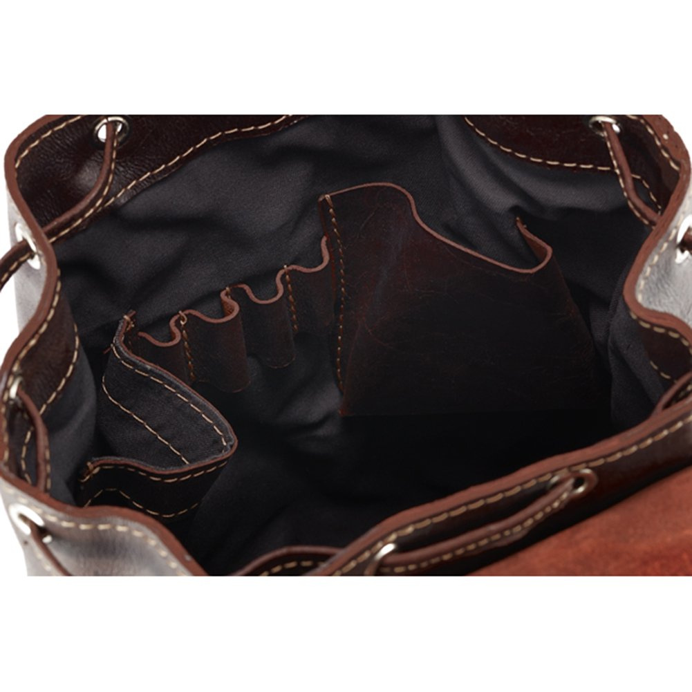 - główna komora ( 25 x 33cm) jest ściągana, otwory do skórzanego paska ściągającego wzmocnione są metalowymi obręczami. Pomieści laptop, tablet