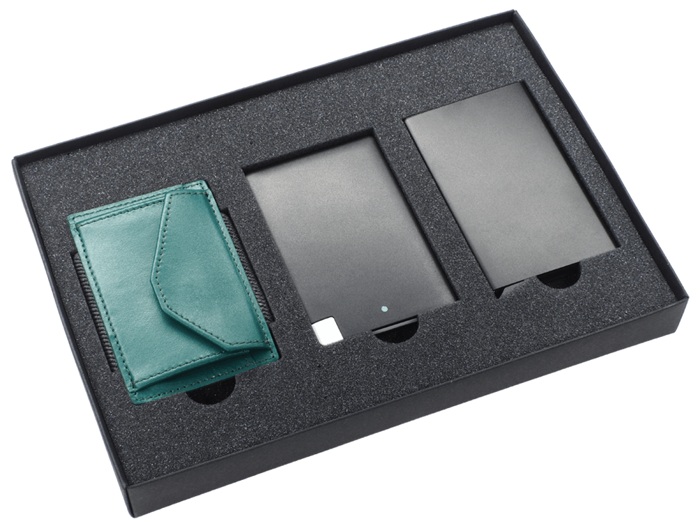 Powerbank posiada wejście i wyjście mini USB oraz adaptery: TYP C i iPhone Lightning Zawiera Power Bank 2500 mAh Zawiera etui na karty Zawiera portfel mini Pudełko papierowe w cenie