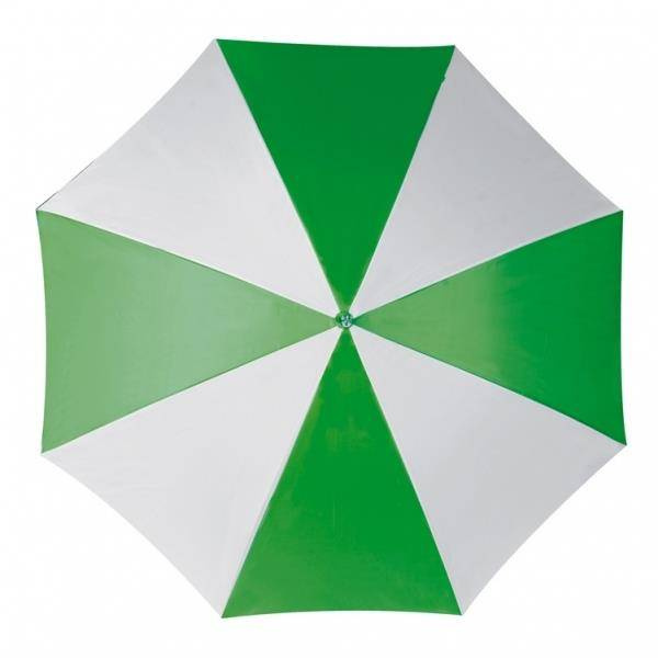 Parasol z prostą, drewnianą rączką. Kolorowe segmenty parasola łączone są na przemian z kolorem białym, dzięki temu parasol przyciąga wzrok i stanowi najtańsze, skuteczne medium reklamowe.
