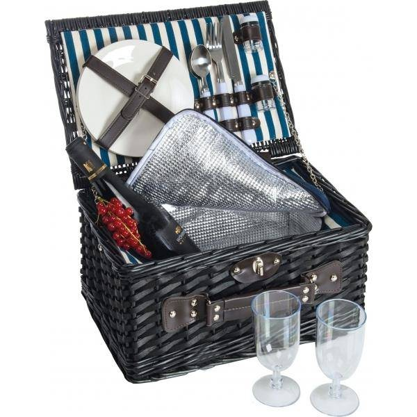 Kosz piknikowy z komorą chłodzącą, wyposażenie wykonane z ceramiki, plastiku i stali nierdzewnej. Pakowany w folijkę.