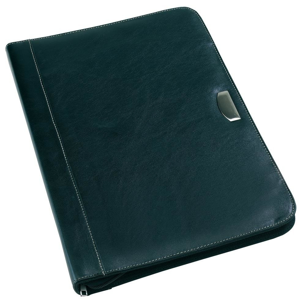 Teczka Noblesse z kalkulatorem, notesem w formacie A4, wieloma kieszonkami, zapinana na zamek, z eleganckim wykończeniem, wymiennym metalowym logo, wykonana z wysokiej jakości skóry