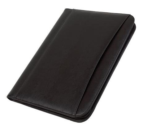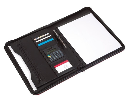 Portfolio Gentle , format A4, zamykane na zamek błyskawiczny, wewnętrzne przegródki w tym jedna przezroczysta, wewnętrzna kieszonka zapinana na zamek, kalkulator, blok do pisania, pętelka na długopis oraz jedna kieszonka zewnętrzna.