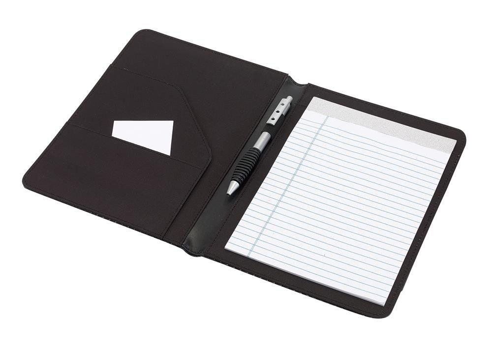 Portfolio Hill Dale w formacie A5: wewnątrz różne wsuwane kieszonki, zawiera notes w linie, pętelkę na długopis – na zewnątrz perforowany wzór, z metalową płytką na Twoje logo