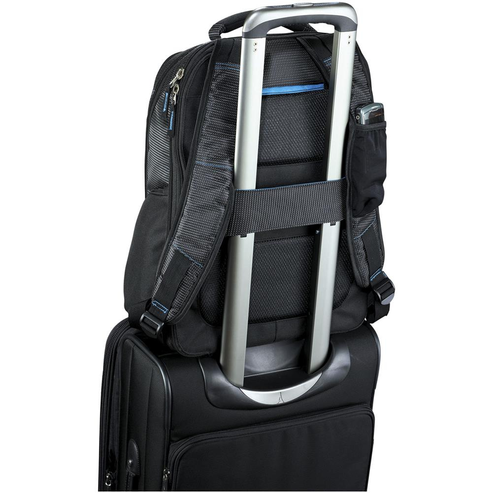 Wyściełany tył z neoprenowym uchwytem i regulowanymi paskami na ramię z kieszonką na media, uchwytem i otworem do mocowania na walizce.