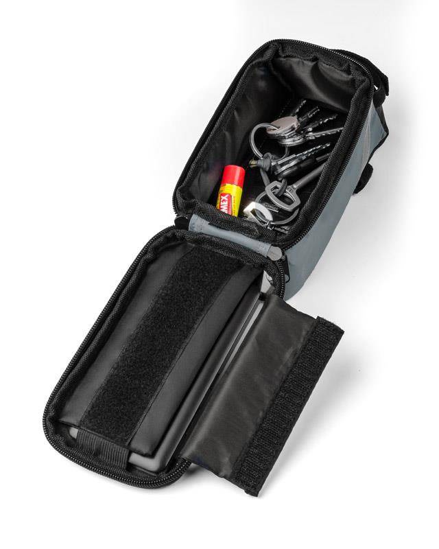 Solidnie mocowana do ramy torba rowerowa posiada pojemną, zapinaną na zamek komorę na drobne przedmioty.