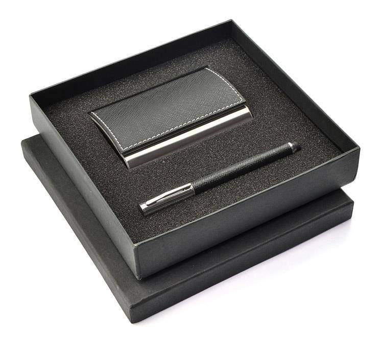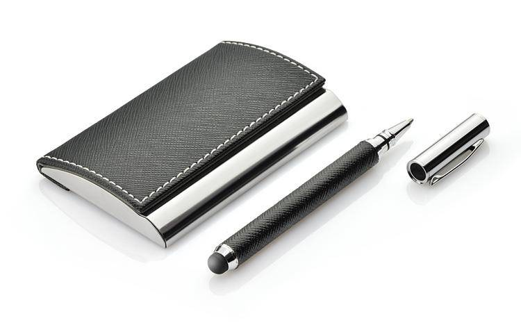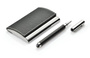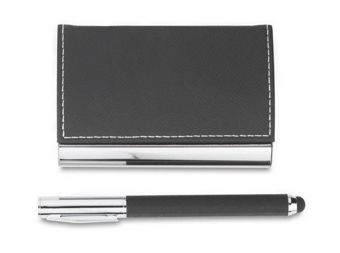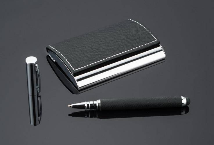 Nowoczesny zestaw upominkowy zawierający elegancki wizytownik z ekosórki PU i metalu oraz długopisu wykończonego ekoskórą PU z funkcja touch pena.