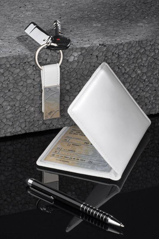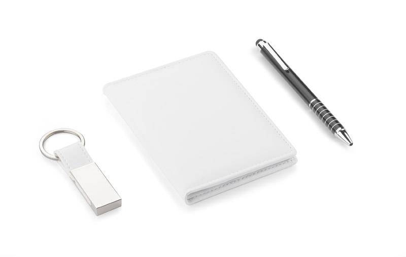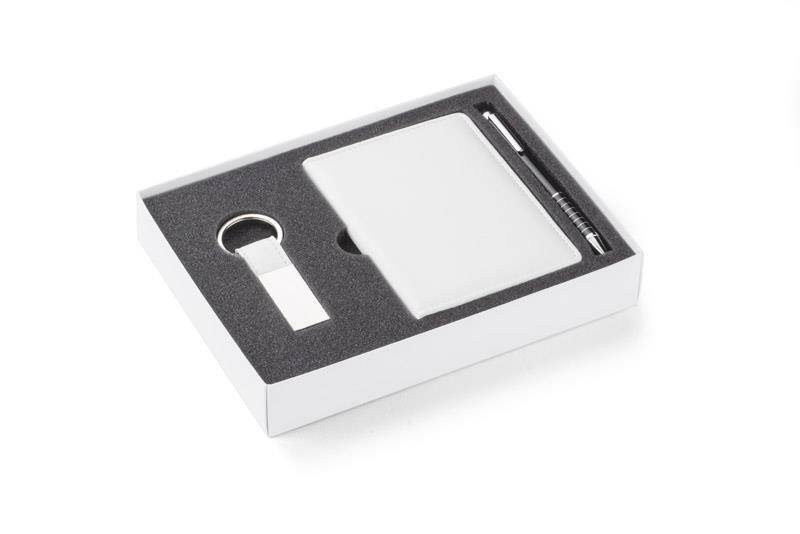 Składa się z breloka, etui na dokumenty oraz długopisu, które zapakowane są w pudełko wykonane z papieru.
