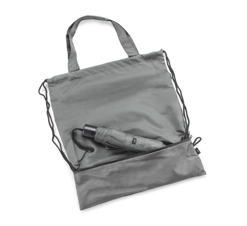 Na dole worka znajduje się zamykana na zamek kieszeń, w której schowany jest dołączony do zestawu parasol, także wykonany z poliestru RPET.