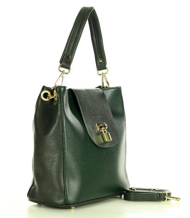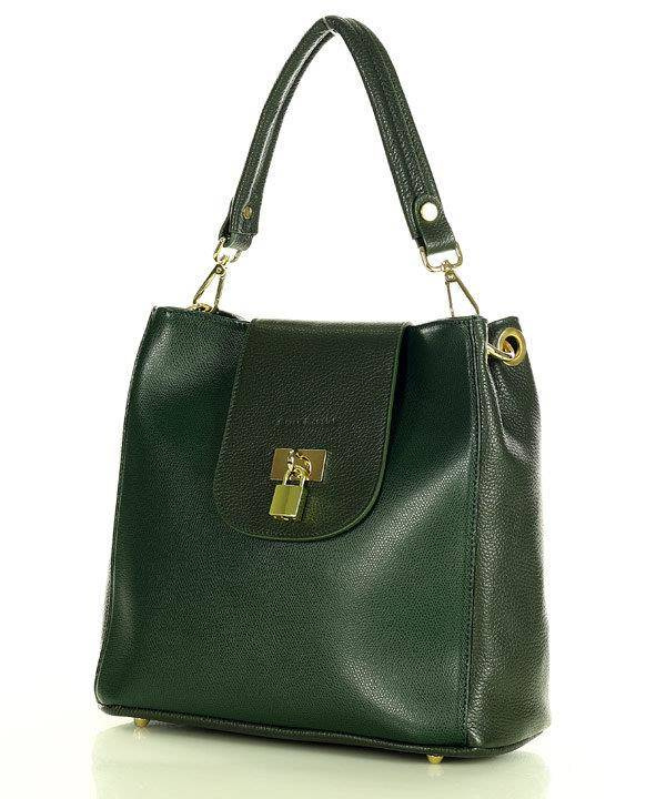 Elegancka torebka na ramię w kolorze ciemnej zieleni wykonana została z dwóch rodzajów skóry naturalnej wysokiej jakości. Połączenie skóry bydlęcej typu Palmellata (na froncie) z mięsistą, miękką skórą naturalną (na klapie i na pozostałej części torebki) dodaje torebce uroku. Skóra typu Palmellata jest sztywniejsza, co pozwala torebce lepiej trzymać fason. Jest to skóra z subtelnym połyskiem uzyskanym dzięki procesom polerowania. Oba rodzaje użytej skóry są niezwykle odporne na działanie czynników zewnętrznych oraz posiadają delikatną fakturę.