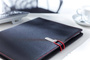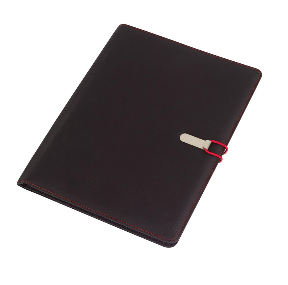 Portfolio SESSION w formacie DIN A4, zawiera notes, pętelkę na przybory do pisania, różne wsuwane kieszenie, metalowy haczyk z kolorową gumką do zamknięcia.