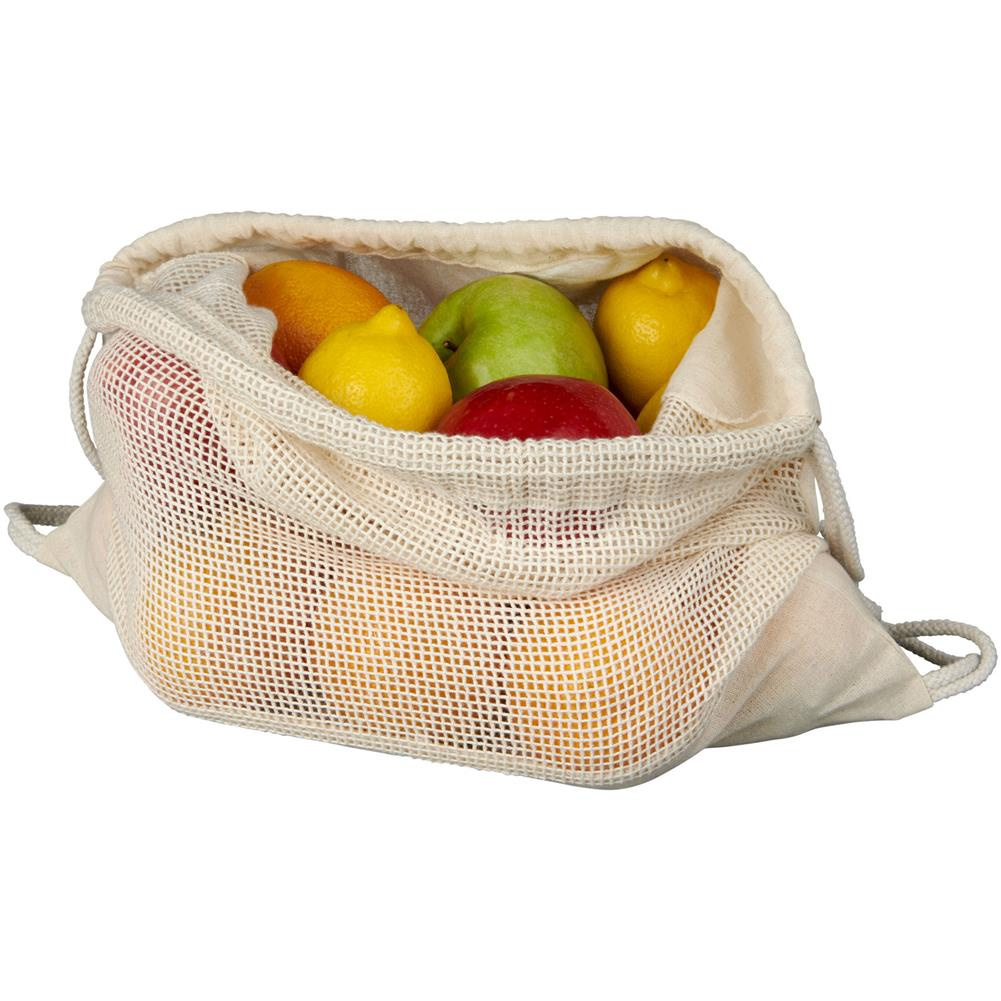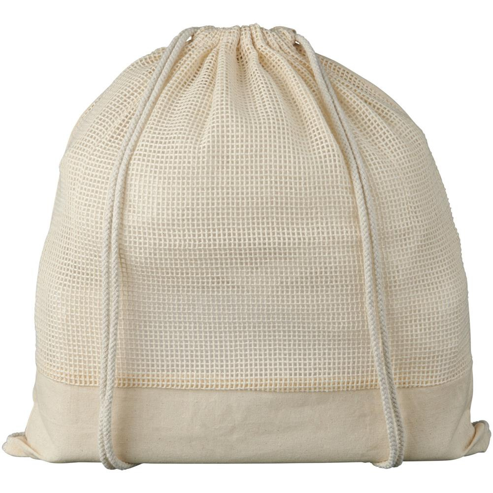 Plecak wielokrotnego użytku na owoce i warzywa wykonany z bawełnianej siatki. Posiada dużą komorę główną ze ściąganym zamknięciem. Wytrzymałość do 5 kg.