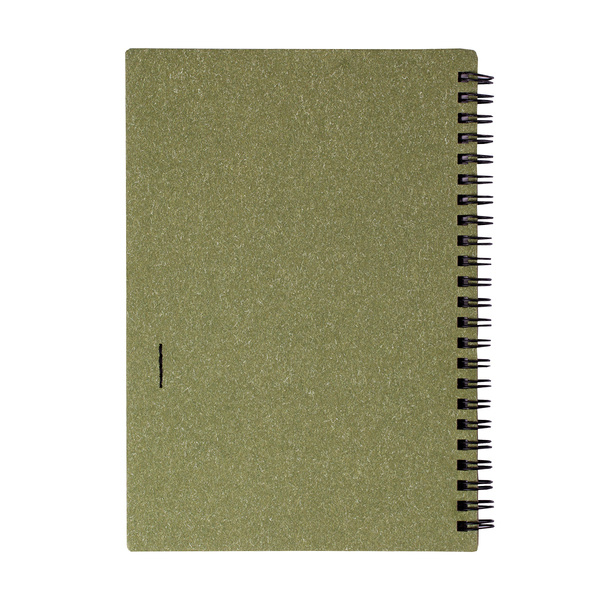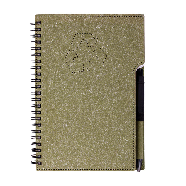 Eko notes w twardej oprawie z dołączonym długopisem w rozmiarze biurkowym (zbliżony do A5 lub większy).