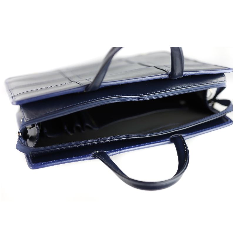 Damska, elegancka teczka uszyta z pasów skóry. Wewnątrz znajduje się jedna komora.