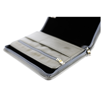 Wewnątrz clip, do którego przymocujesz recepty, po przeciwnej stronie 2 skórzane kieszonki, jedna długa kieszeń zasuwana na suwak oraz duża przegroda.