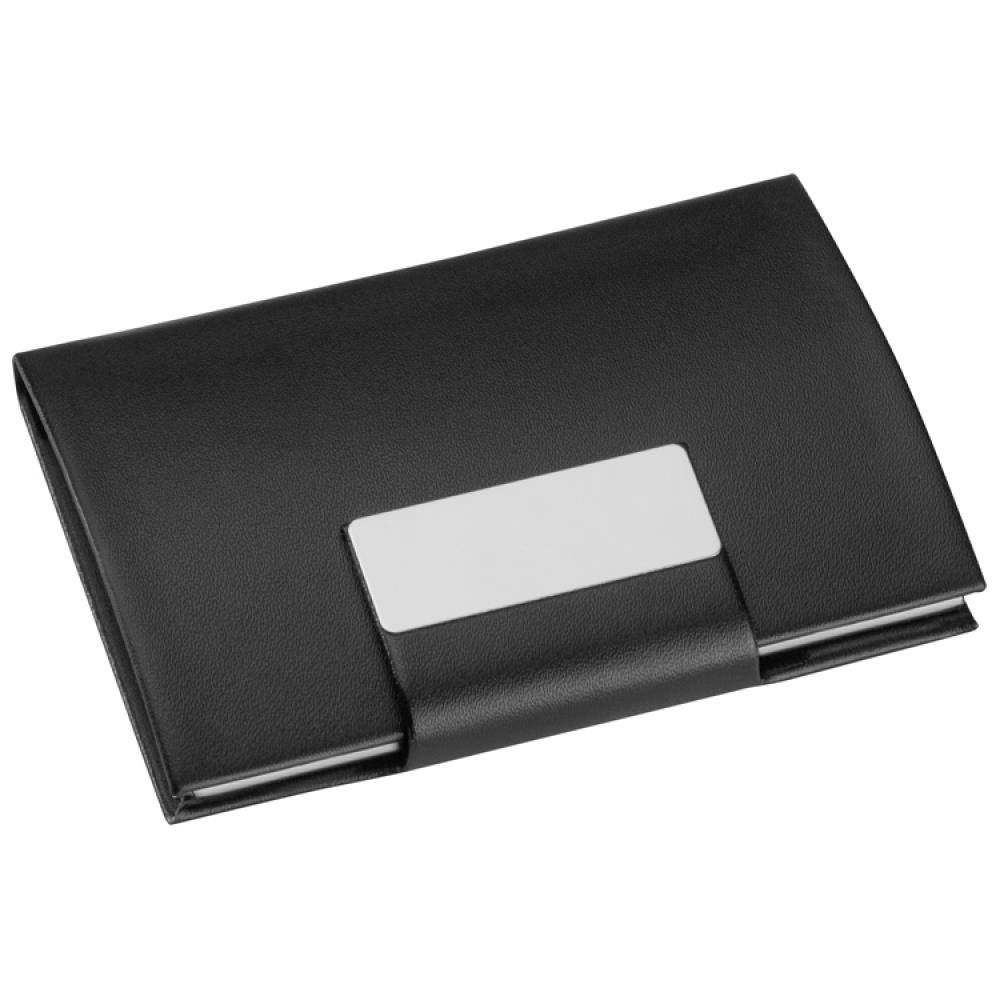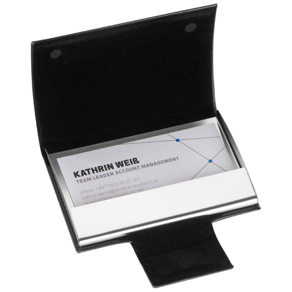 Etui na wizytówki wykonane z metalu i skóry ekologicznej z magnetycznym zapięciem.