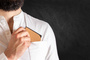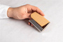Wizytownik z metalu w korkowej obudowie, zamykany na magnetyczny zatrzask, z materiałową wyściółką.