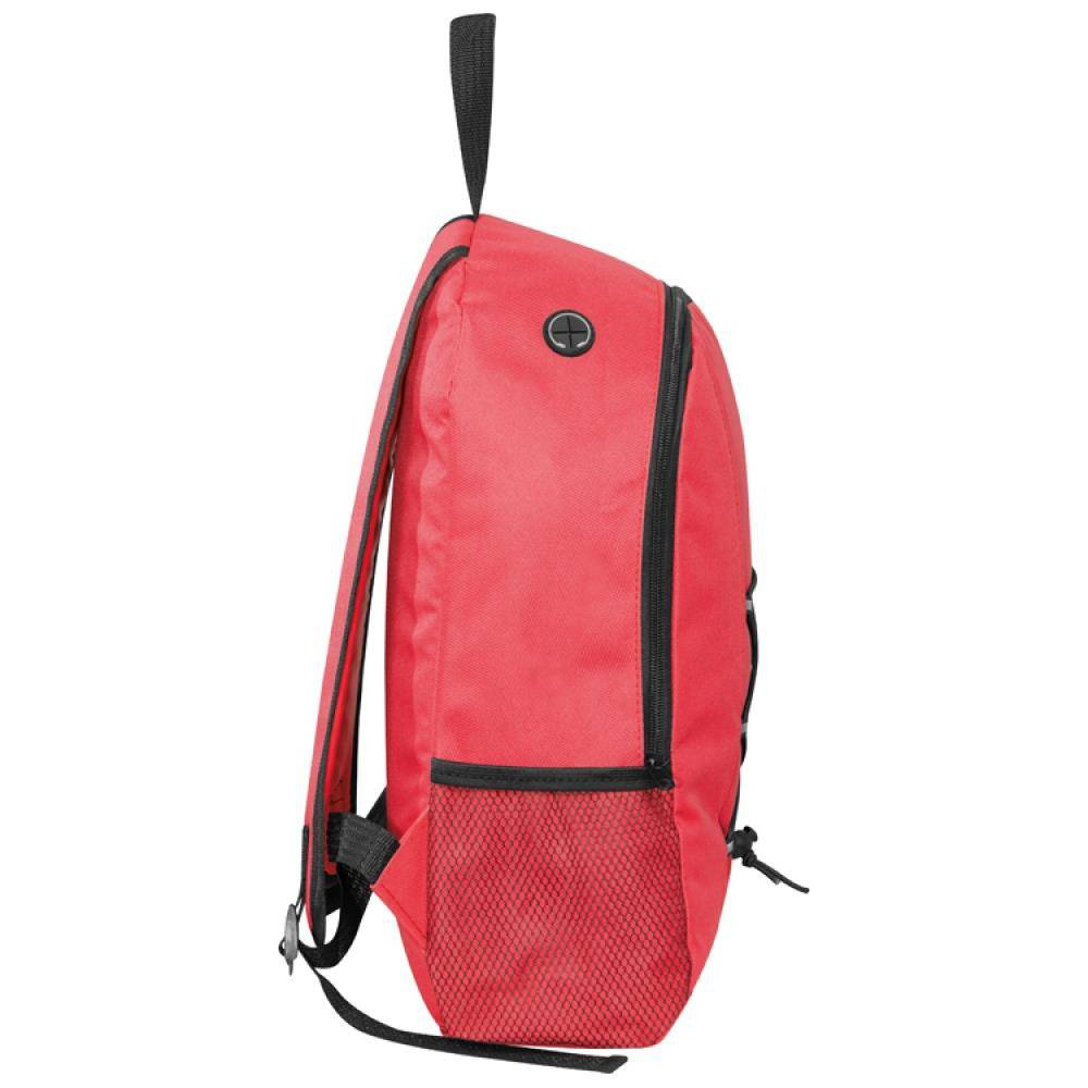 Plecak z poliestru 600D, zapinany na suwak, posiada dwie kieszenie boczne z siatki, wyjście na słuchawki oraz miękkie, regulowane szelki.