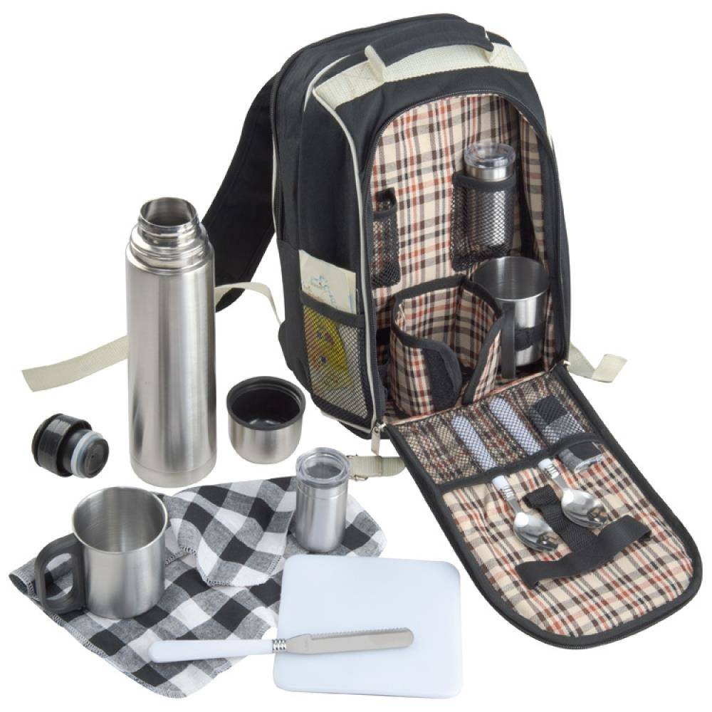 Zawiera wyposażenie dla 2 osób: termos ze stali nierdzewnej, dwa stalowe kubki, pojemniki na sól i pieprz, małą deskę, sztućce i serwetkę.