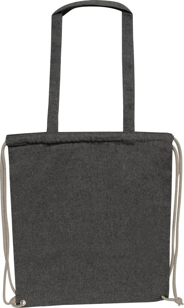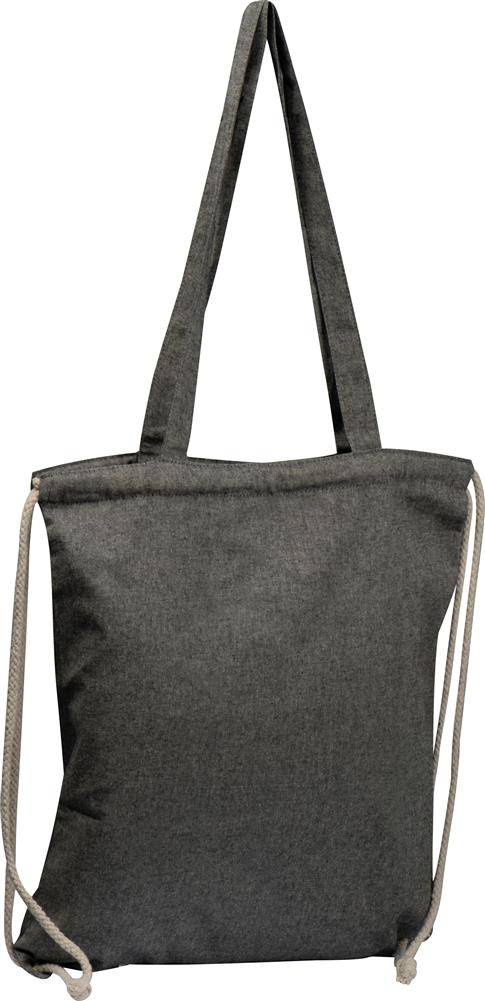 Torba posiada długie uchwyty do noszenia na ramieniu i sznurki do zamykania i noszenia na plecach.