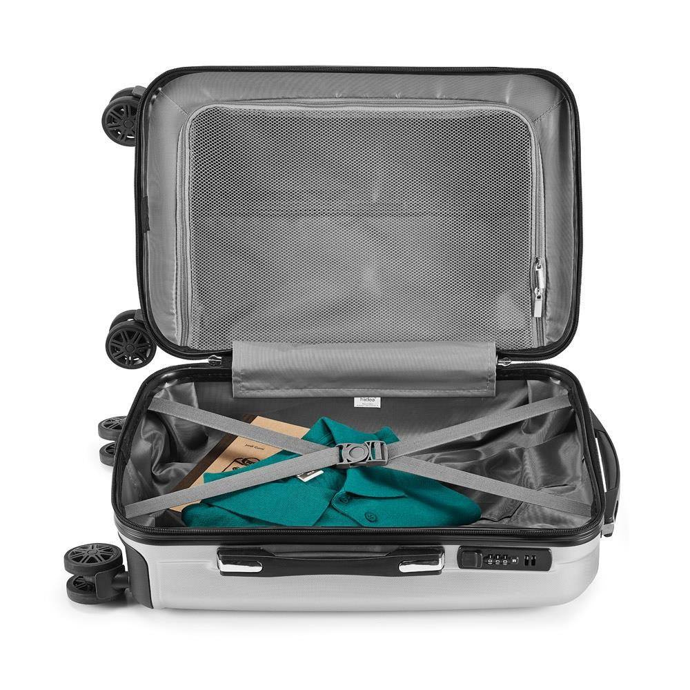 Walizka na kółkach wykonana z ABS i PET. Wyściełane wnętrze, z jedną przegrodą. Posiada 4 obrotowe podwójne kółka, regulowany aluminiowy uchwyt z przyciskiem oraz zamek szyfrowy. Zawiera wyjmowaną metalową płytkę do personalizacji. Pojemność do 33 L. Waga: 2.70 kg. Metalowa płytka do walizki z możliwością znakowania laserem, dostarczana oddzielnie.335 x 540 x 225 mm | Metalowa płytka: 60 x 30 mm