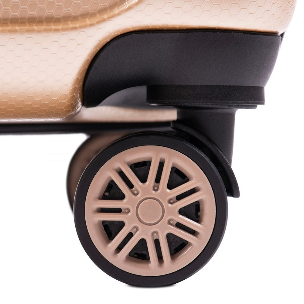 Nowoczesny, lekki model wykonany z bardzo wytrzymałego i odpornego na zarysowanie poliwęglanu, z dwupoziomową teleskopową rączką. Zewnętrzne, przyjemne w dotyku gumowe uchwyty oraz zamek szyfrowy uniemożliwiający dostanie się do wnętrza osobom niepożądanym. Trwały, duraluminiowy stelaż wbudowany w walizkę. Wyposażony w cztery, podwójne obrotowe kauczukowo-gumowe kółka, które zapewniają stabilność oraz lekkość prowadzenia w dowolnym kierunku. Wnętrze w ciemnym sygnowanym kolorze dzielone zamkiem błyskawicznym na dwie funkcjonalne komory.