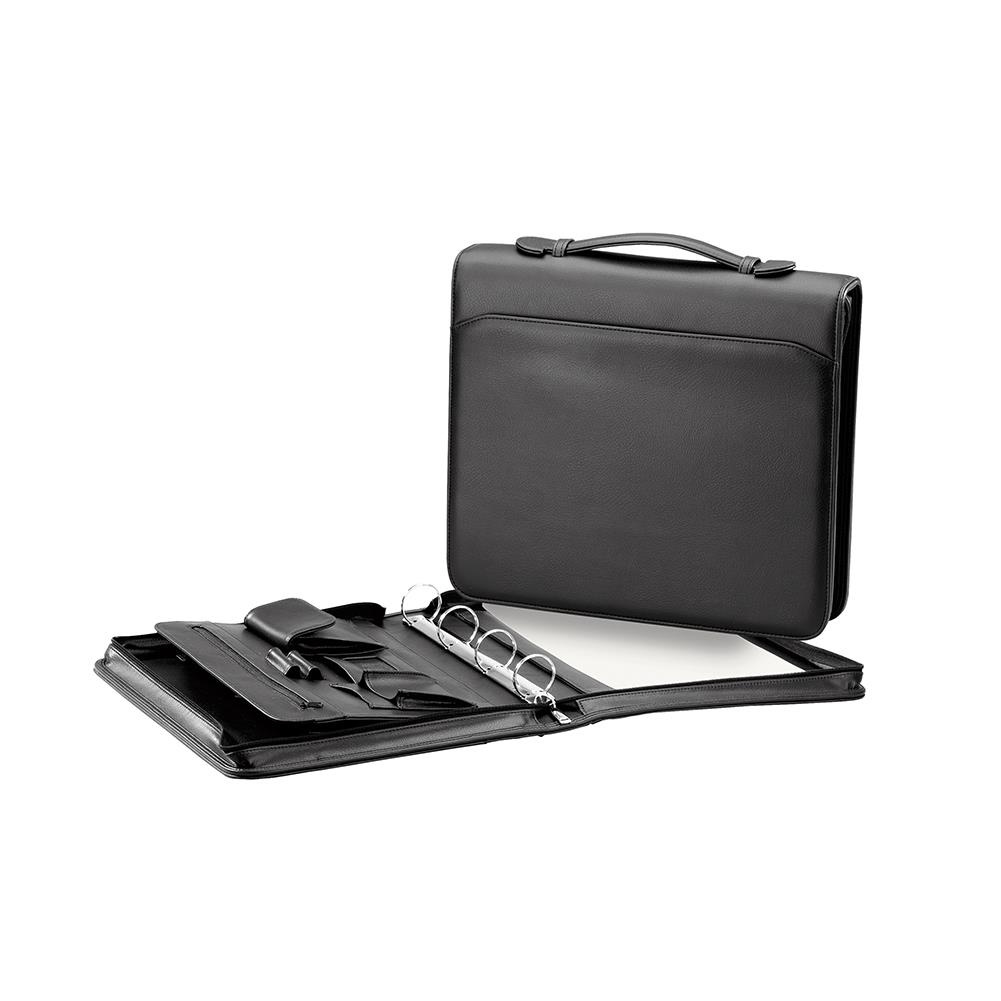 Teczka na dokumenty wykonany ze skóry naturalnej i materiału poliuretanowego z dużym mechanizmem pierścieniowym.