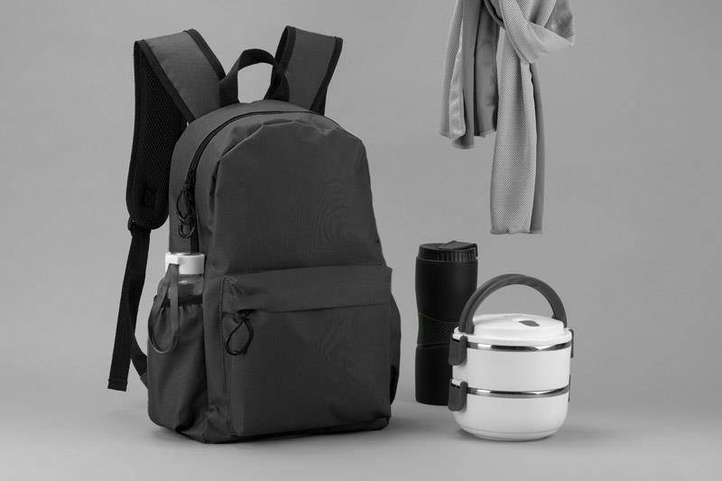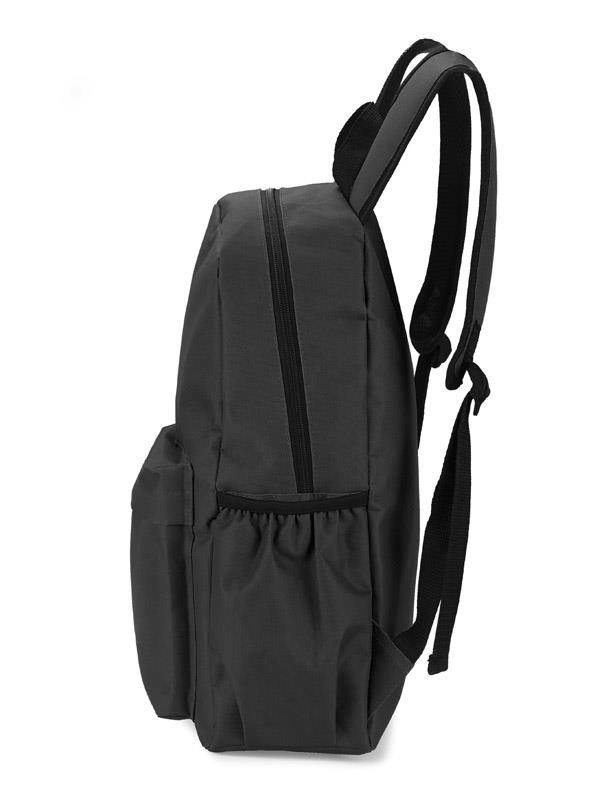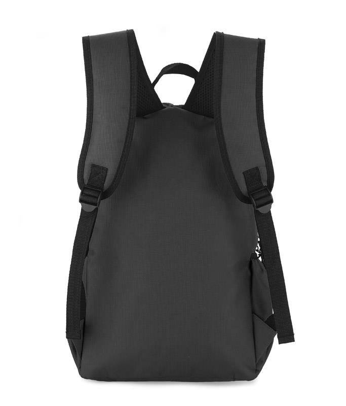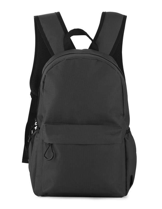 Plecak GINNI wykonany jest z poliestru 600D. Posiada jedną komorę główną zapinaną dwoma suwakami. Z przodu znajduje się spora kieszeń zapinana na zamek, która pomieści potrzebne drobiazgi. Po obu stronach znajdują się otwarte przegrody z gumką mieszczące bidon z wodą. Dno i plecy nie są usztywniane.
