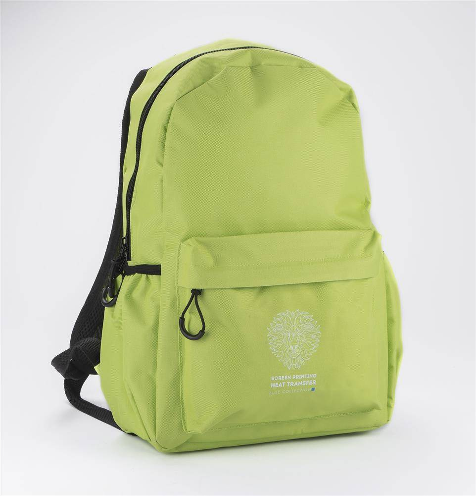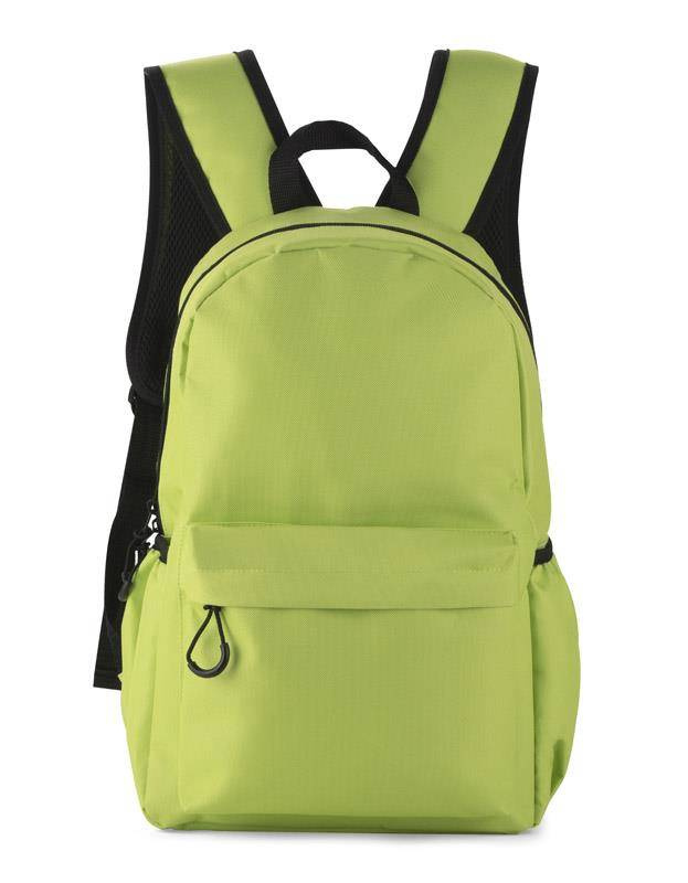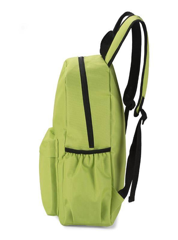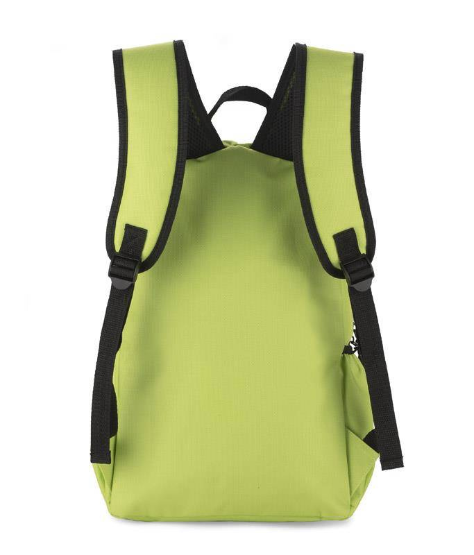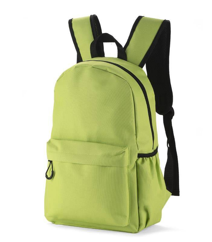 Plecak GINNI wykonany jest z poliestru 600D. Posiada jedną komorę główną zapinaną dwoma suwakami. Z przodu znajduje się spora kieszeń zapinana na zamek, która pomieści potrzebne drobiazgi. Po obu stronach znajdują się otwarte przegrody z gumką mieszczące bidon z wodą. Dno i plecy nie są usztywniane.