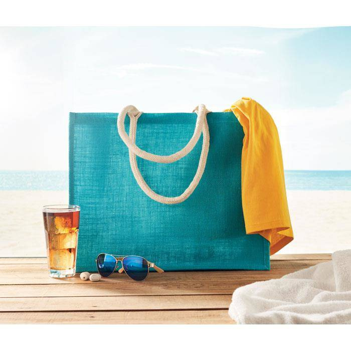 Laminowana jutowa torba plażowa lub na zakupy z bawełnianym uchwytem.