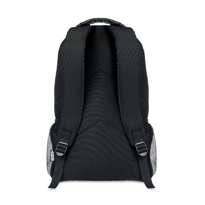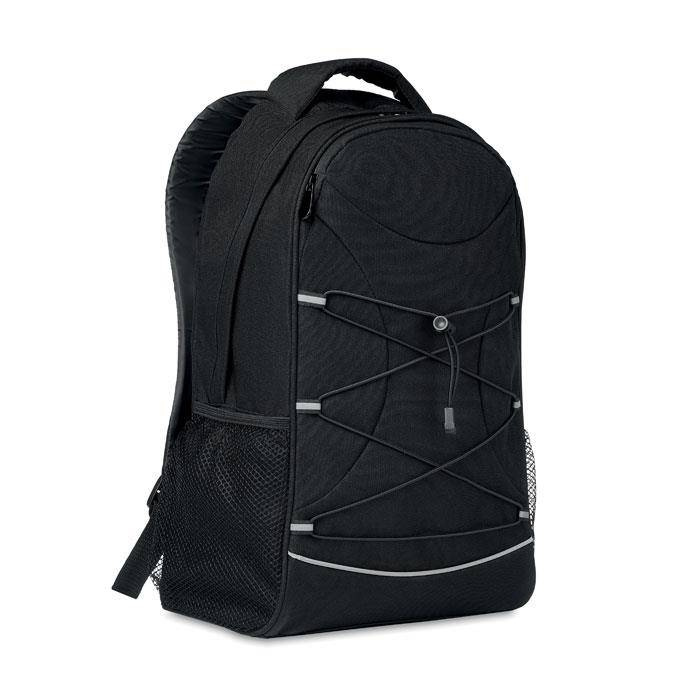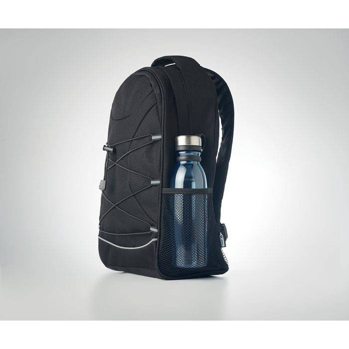 Plecak wykonany z materiału 600D RPET z odblaskowymi detalami z przodu i kieszeniami z siatki po obu stronach.