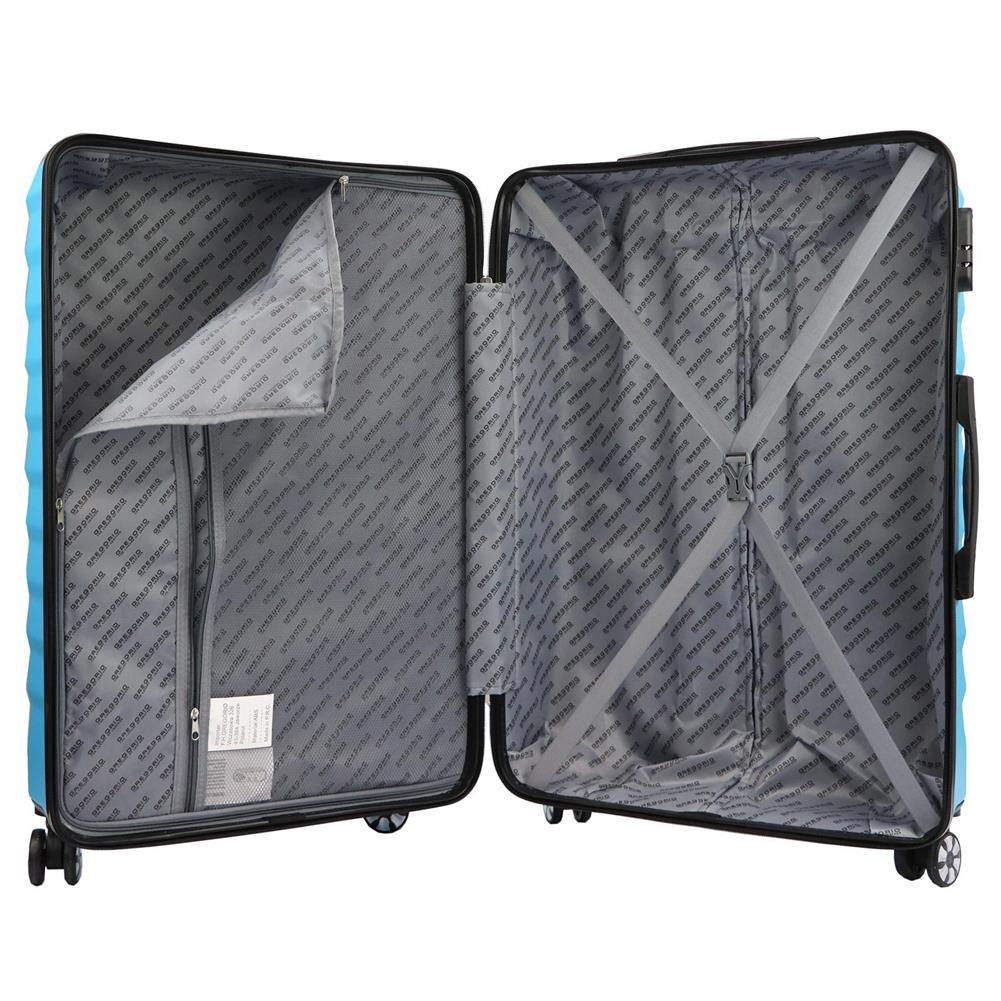 Zestaw składa się z trzech walizek w rozmiarach 20, 24 i 28 cali i kuferka na kosmetyki i drobiazgi w rozmiarze 14 cali..
