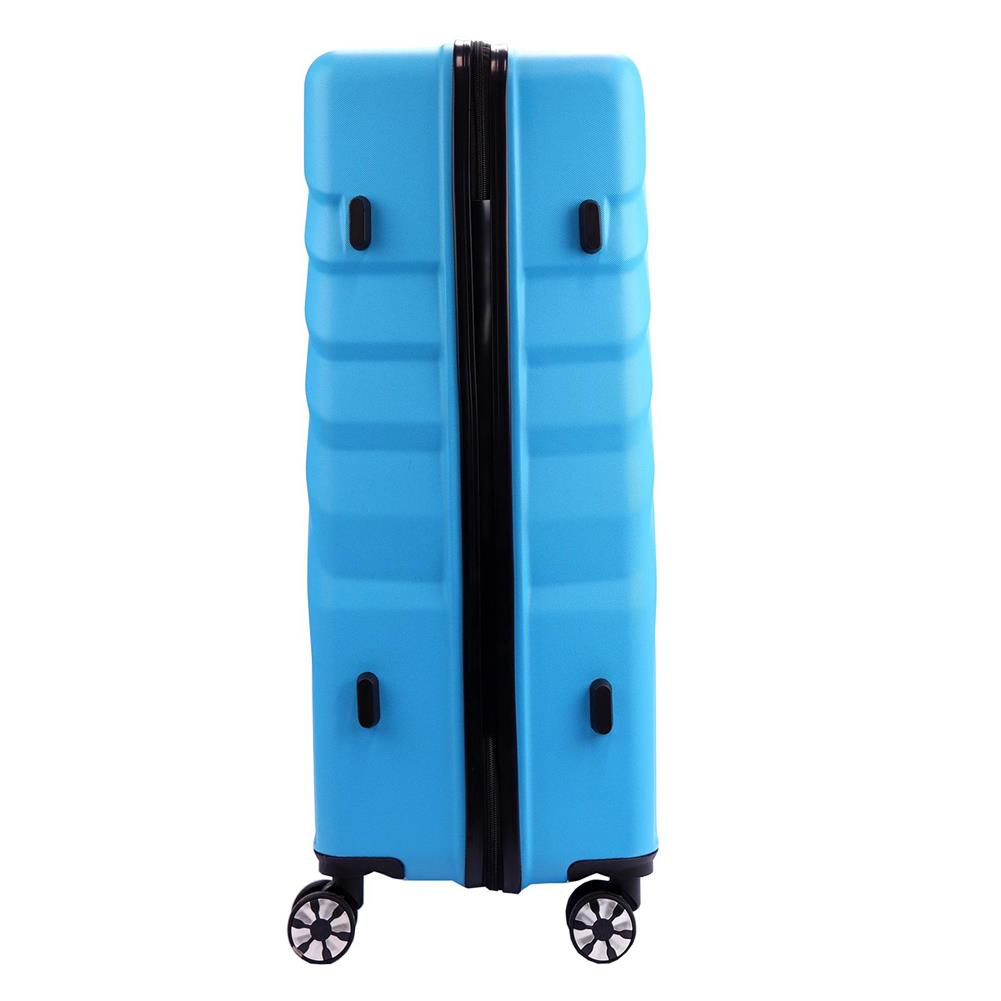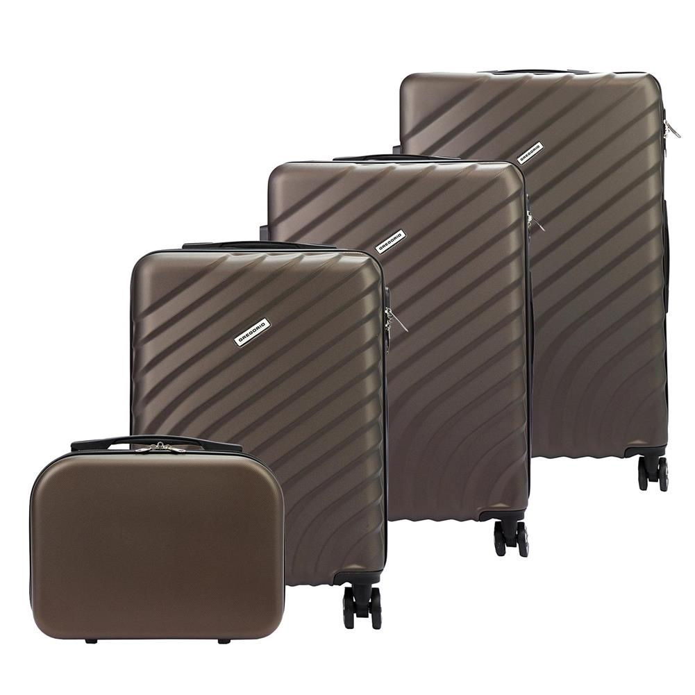 Zestaw składa się z trzech walizek w rozmiarach 20, 24 i 28 cali i kuferka na kosmetyki i drobiazgi w rozmiarze 14 cali..