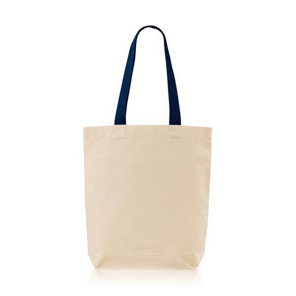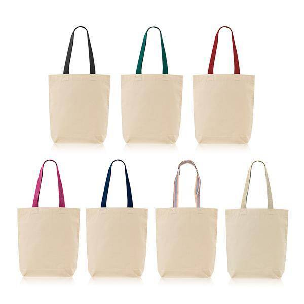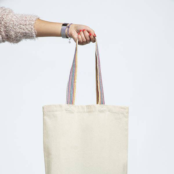 Klasyczna torba bawełniana w naturalnym kolorze z dwoma długimi, kolorowymi uchwytami.