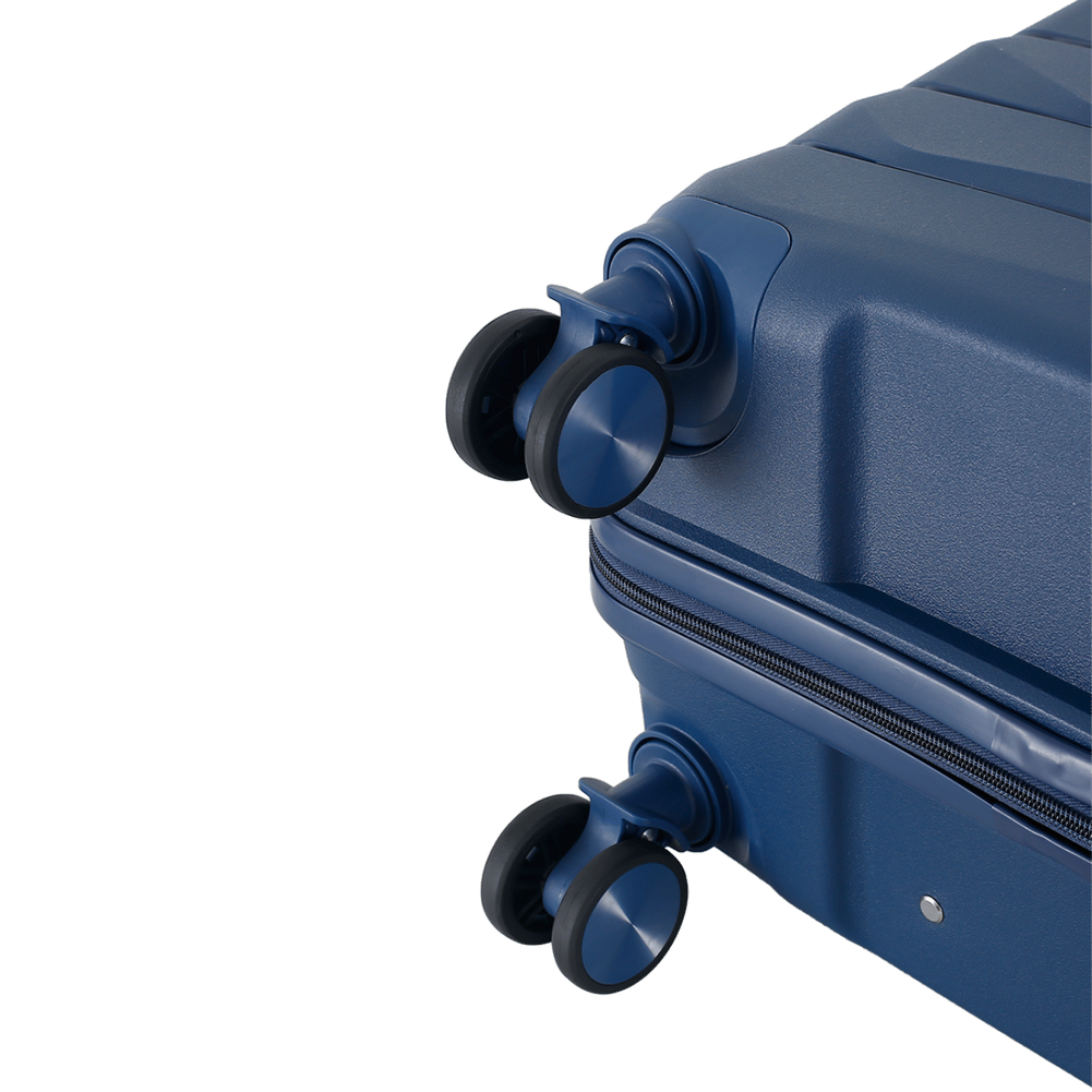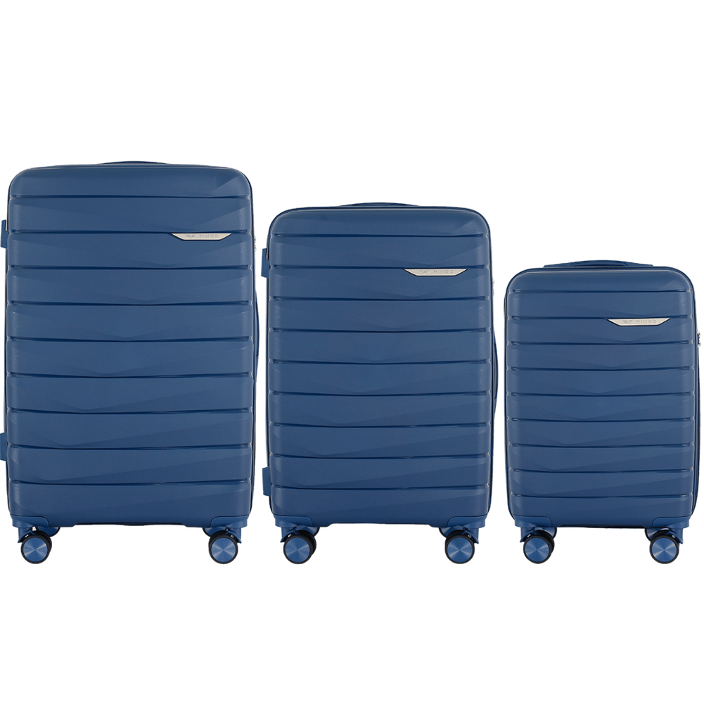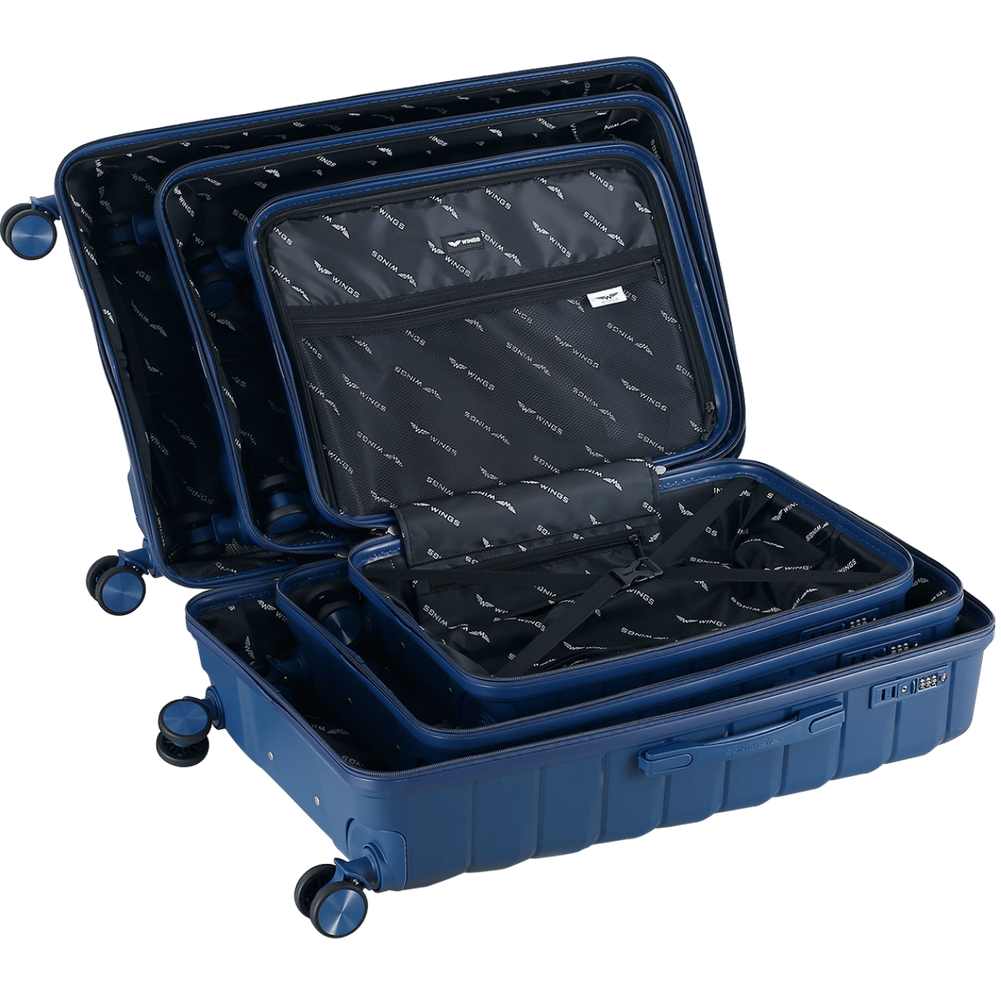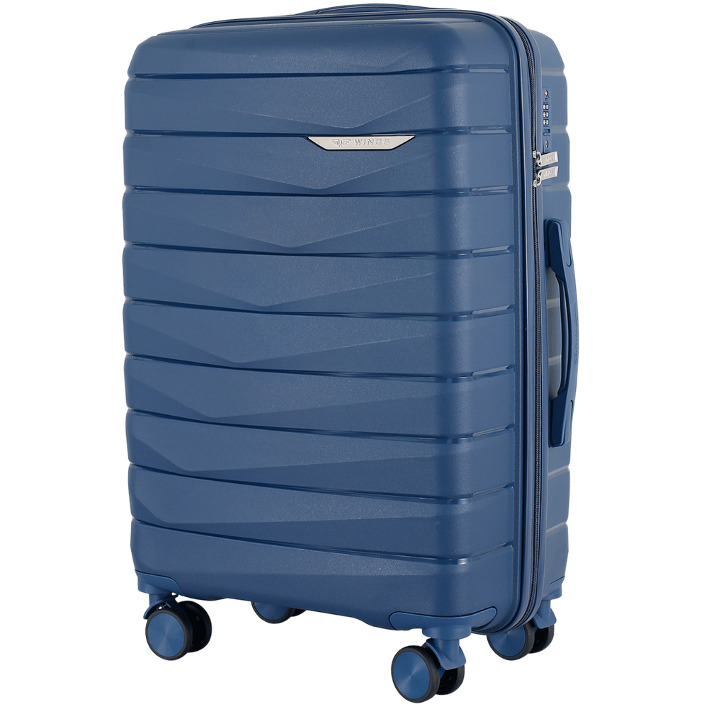 WINGS MUR01 wykonany z wytrzymałego polipropylenu łączy styl, funkcjonalność i niezawodność. W skład zestawu wchodzą trzy rozmiary walizek: 28", 24" oraz kabinowa 20". Walizka średnia i duża zostały wyposażone w funkcjonalne stopki w formie wieszaków. Model posiada klasyczne jednolite i eleganckie kolory, podwójne niezawodne kółka obrotowe 360 stopni dla łatwego manewrowania, regulowaną rączkę teleskopową i zamek TSA dla bezpieczeństwa. Wnętrze wyposażone jest w dwie komory: jedną z pasami zabezpieczającymi, drugą zamykaną na suwak z siatkowaną kieszenią oraz dodatkową kieszenią na drobne przedmioty. Czarna podszewka wewnątrz sygnowana logiem Wings.