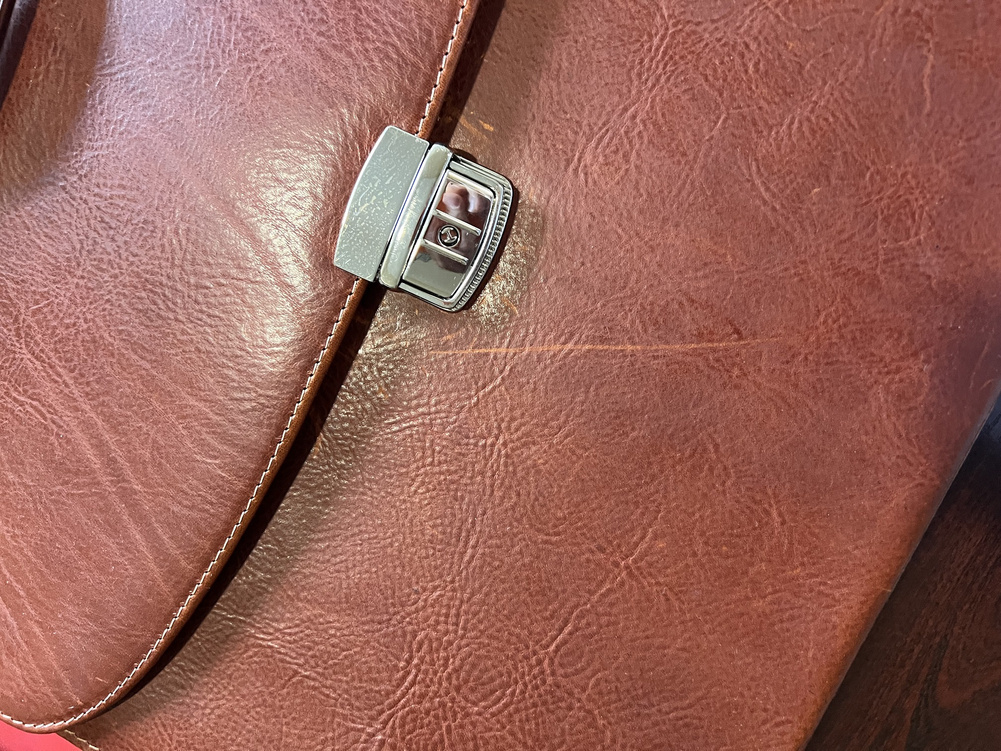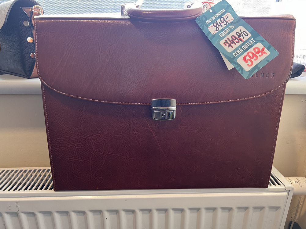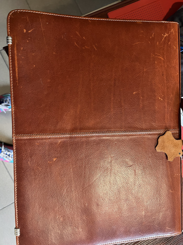 Teczka wykonana ze skóry naturalnej, wysokiej jakości lecz w kilku miejscach jest zarysowana (ostatnie 3 zdjęcia)