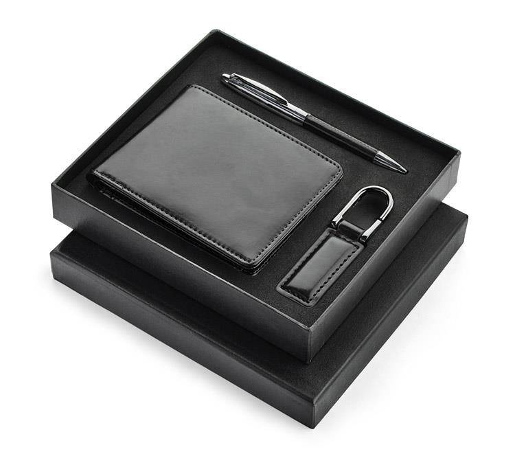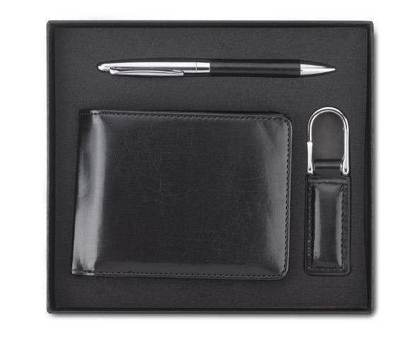 - Komplet upominkowy zawierający portfel, brelok oraz metalowy długopis.