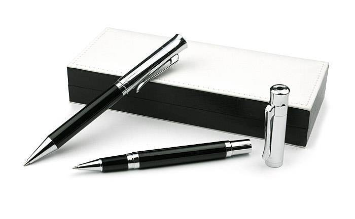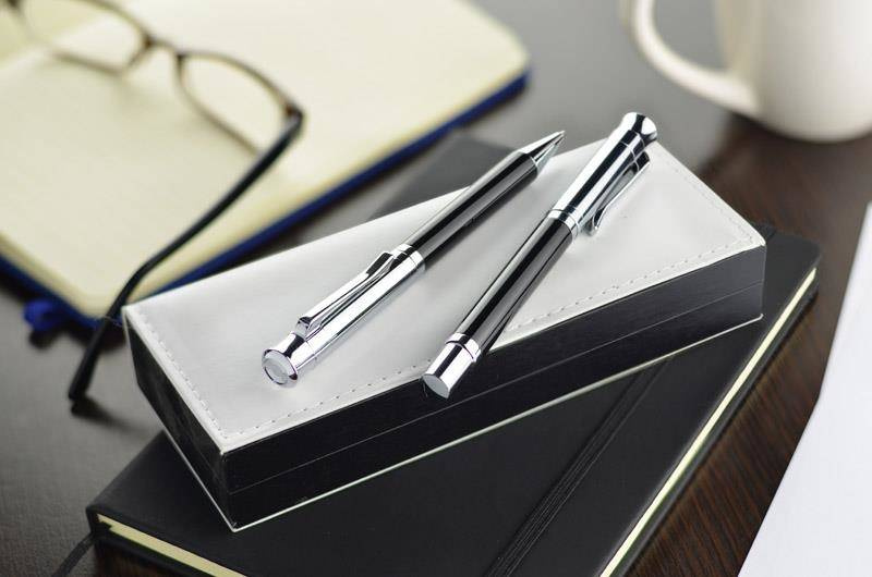 • Zawiera metalowy długopis i pióro kulkowe oraz etui wykonane z ekoskóry.