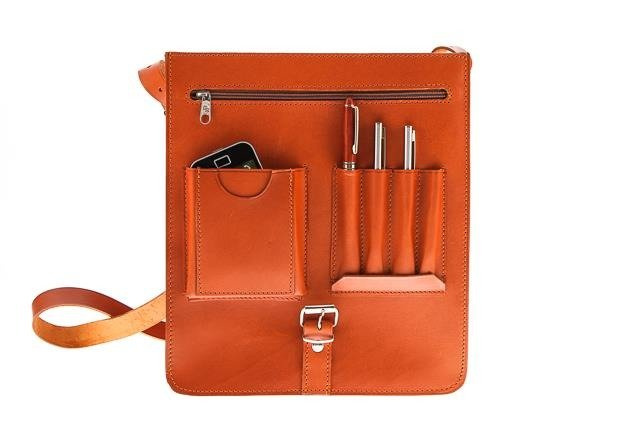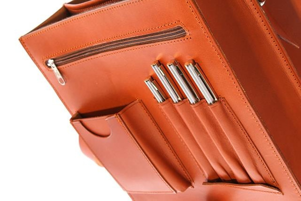 Duża dwukomorowa skórzana raportówka w stylu vintage mieszcząca format A4. Torba dedykowana dla biznesmenów i studentów. Klapa zamykana na tradycyjną klamrę. Pod klapą ukryte mini biuro kieszeń zapinana na zamek, kieszonka na smartfon, miejsce na wizytówki, cztery miejsca na długopisy. Dwie komory z łatwością pomieszczą gabarytowe przedmioty typu: laptop, segregator, teczkę z dokumentami, skoroszyt, itp. Pas nośny z regulowaną długością można odpiąć i dzięki uchwytowi możemy nosić torbę w ręku.