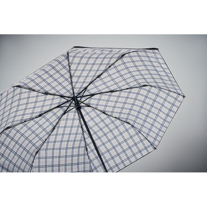 23-calowy wiatroodporny parasol z podwójną warstwą 190T pongee z wewnętrznym wzorem w kratkę. Czarna, platerowana rama i trzon. Dwuczęściowa, czarna, niklowana część środkowa z włókna szklanego. Zakrzywiony, gumowany uchwyt z ABS.